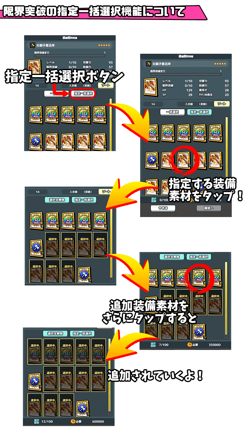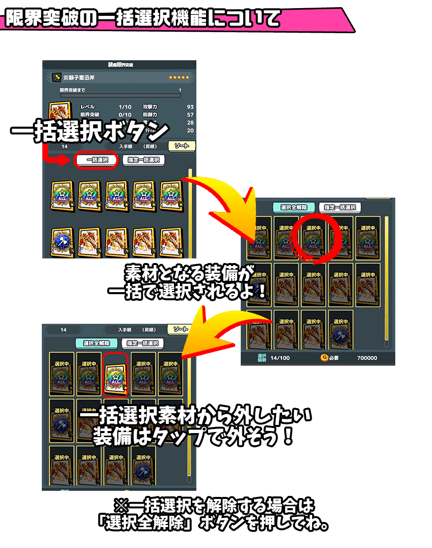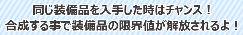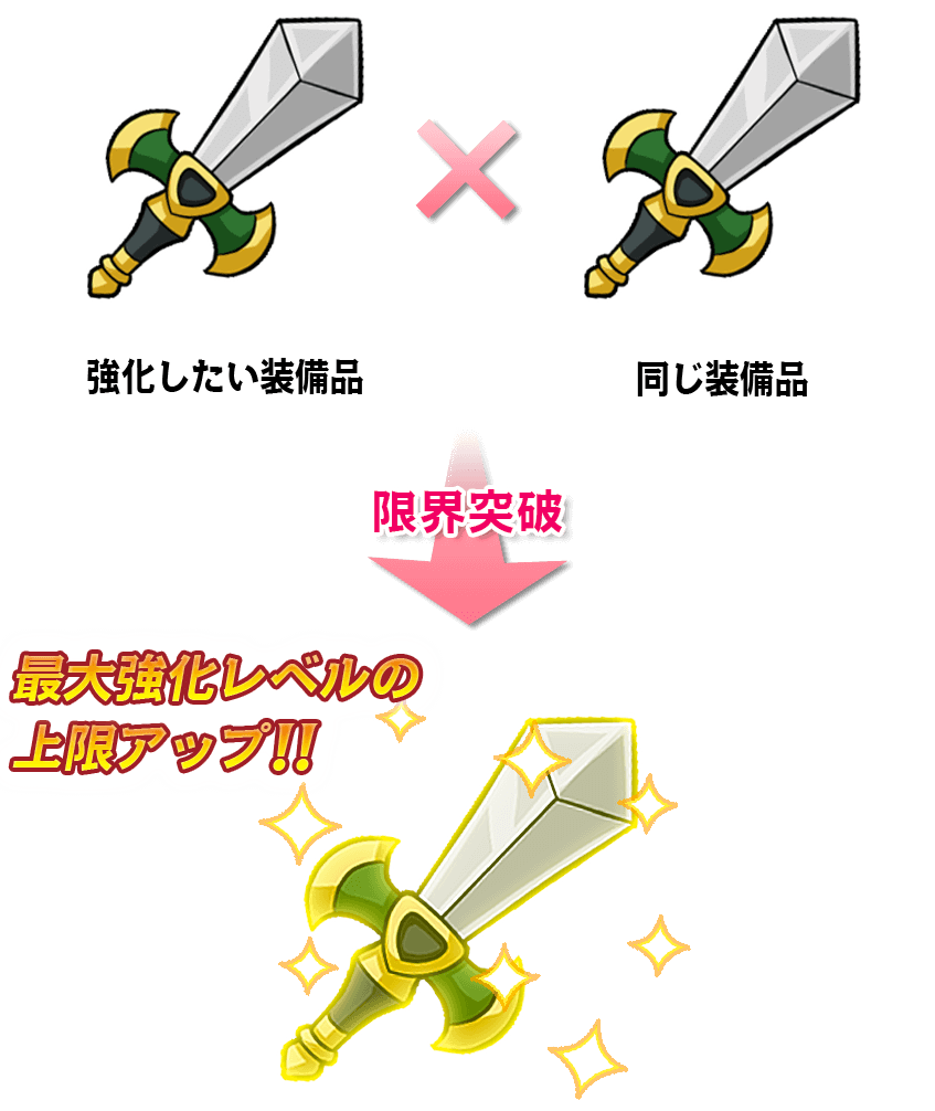 装備の強化はレベル10が上限だけど、限界突破することで強化のレベル上限が解放されるよ。