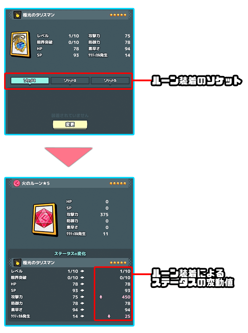 ルーンは火・水・雷・風・光・闇の6種類とレアリティがあって、それぞれ違うステータスを持っているよ。長所を伸ばすも良し!短所を補うも良し!ルーンで自分好みの装備品をカスタマイズしよう!
