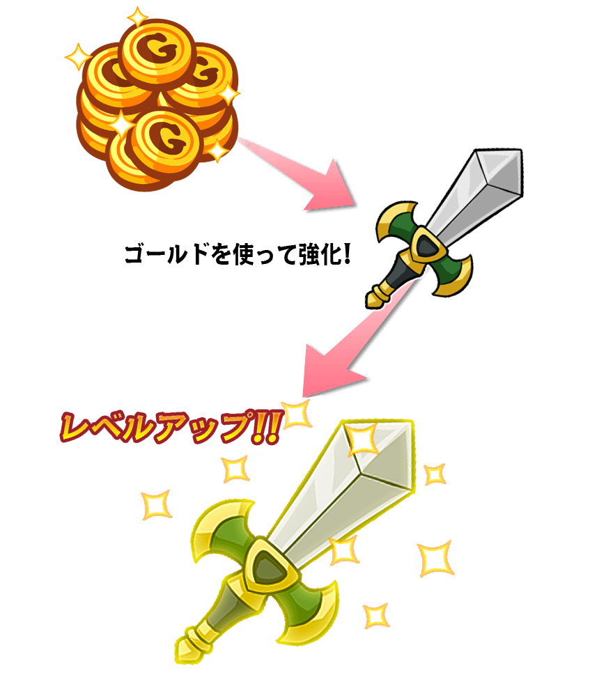 装備品はゴールドで強化可能!レベルアップするとステータスが大幅にアップするよ!