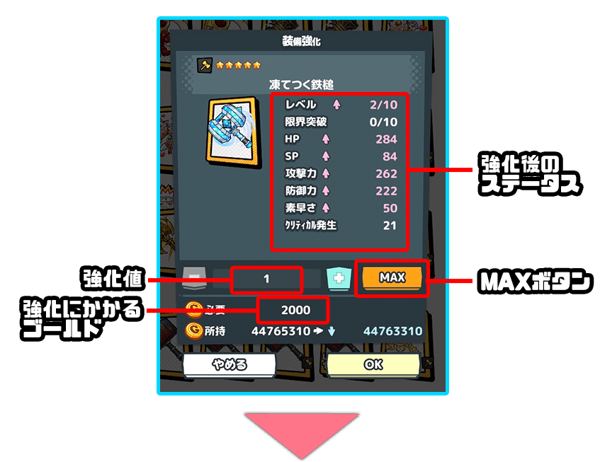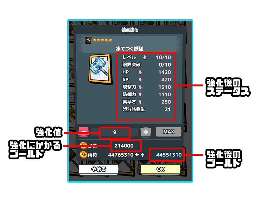 強化費用や強化後のステータスなどを確認して、問題がなければ右下の「OK」ボタンを押して強化を実行しよう!